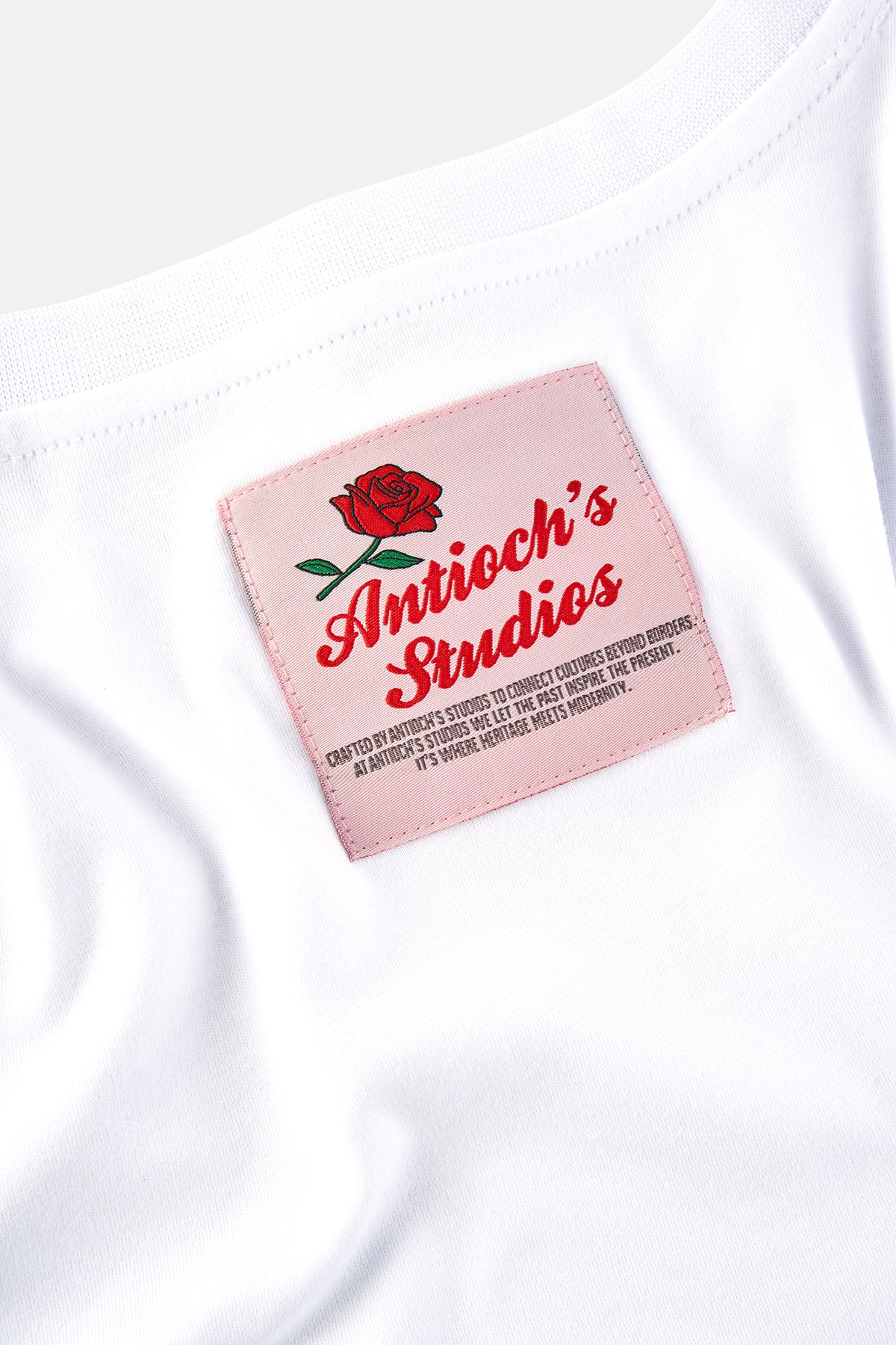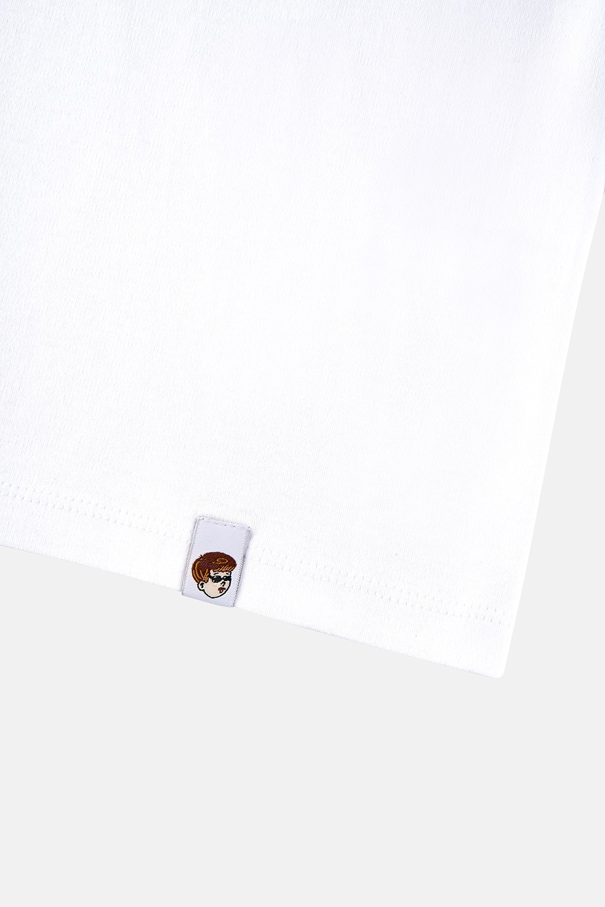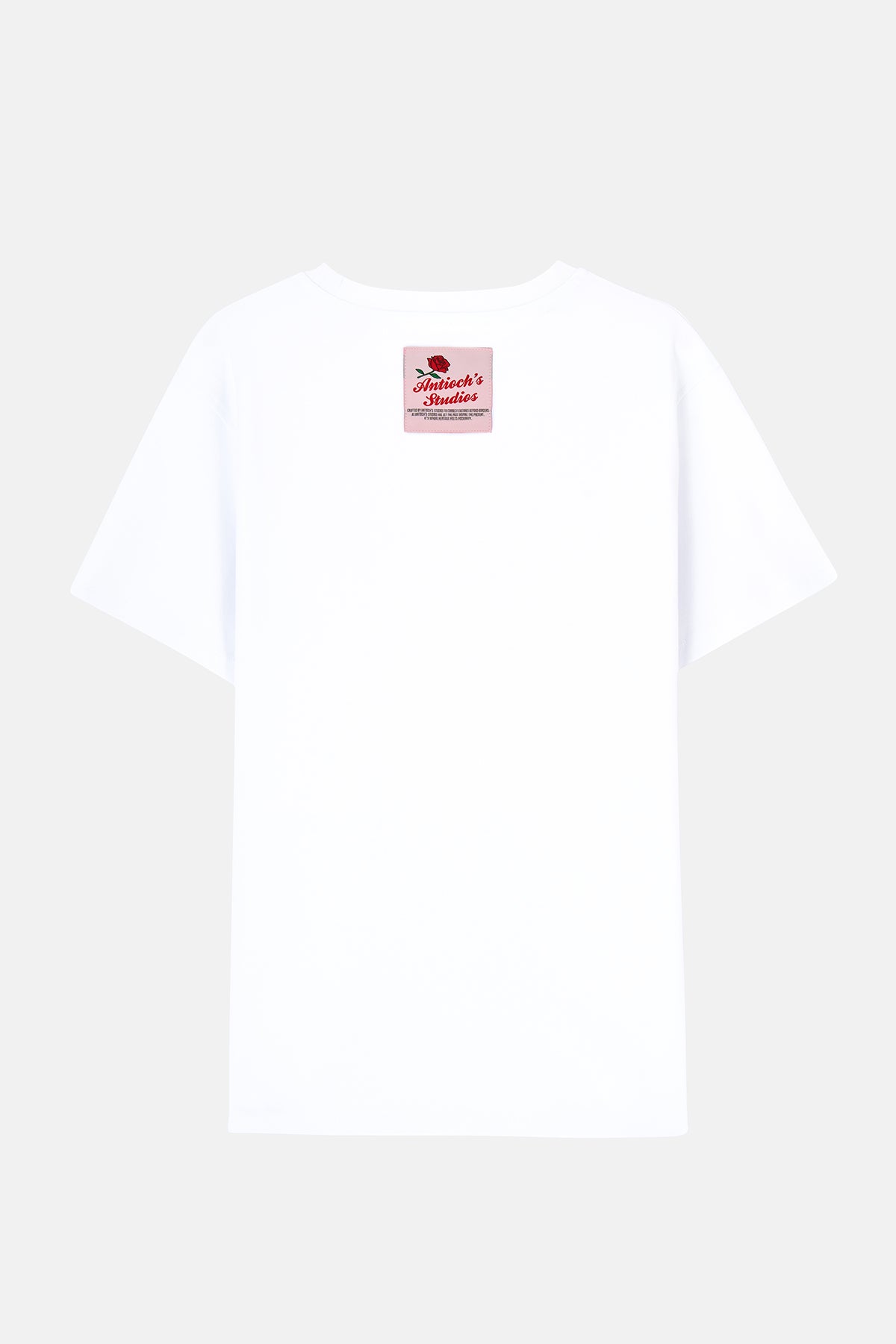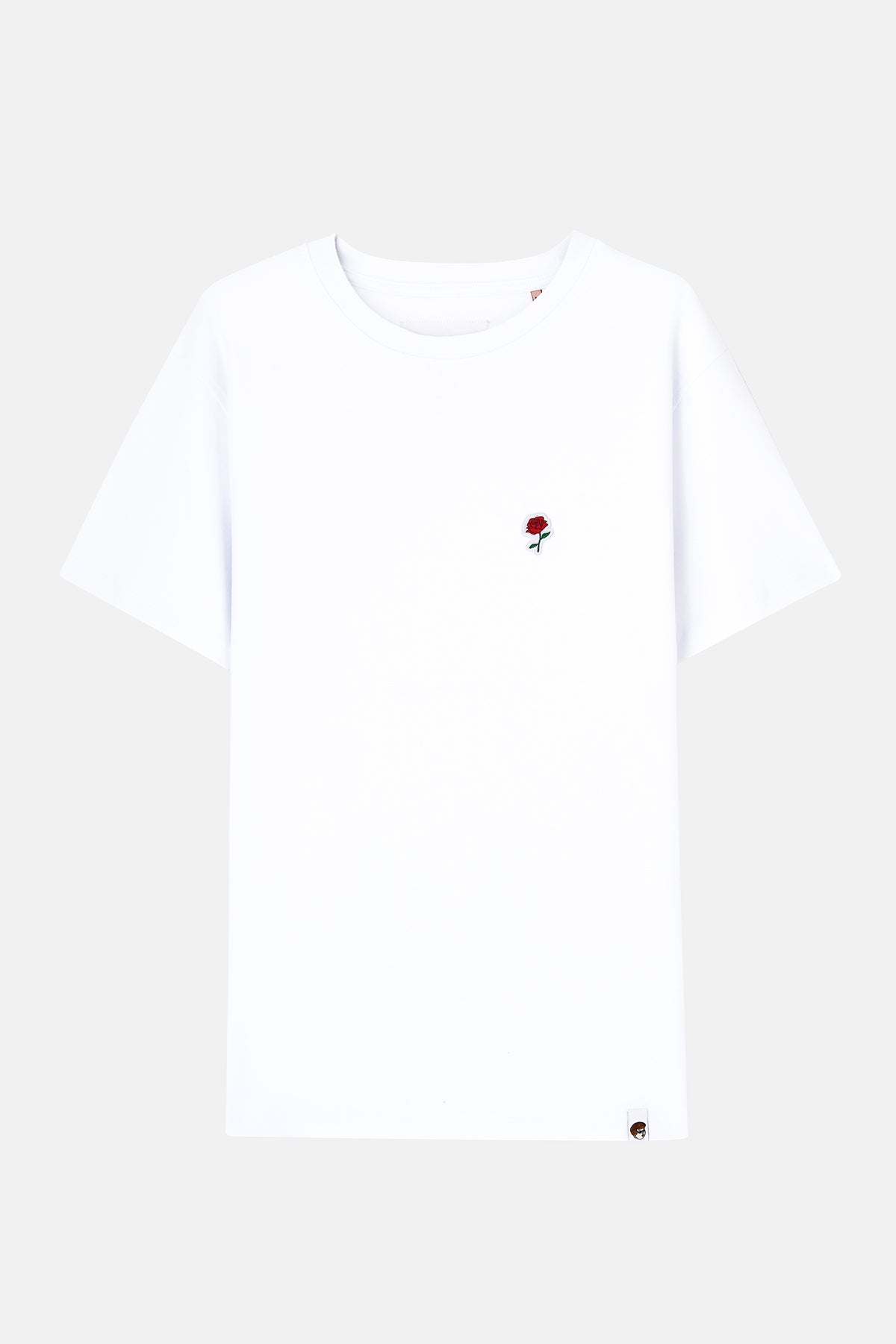 White short-sleeved T-shirt made from premium-weight 100% cotton. Designed with a relaxed fit and an easy-to-wear length. The front features an embroidered rose, and the brand label is stitched on the outside back for a distinctive detail. Produced in Türkiye by Reflect Studio with a commitment to quality and craftsmanship.
